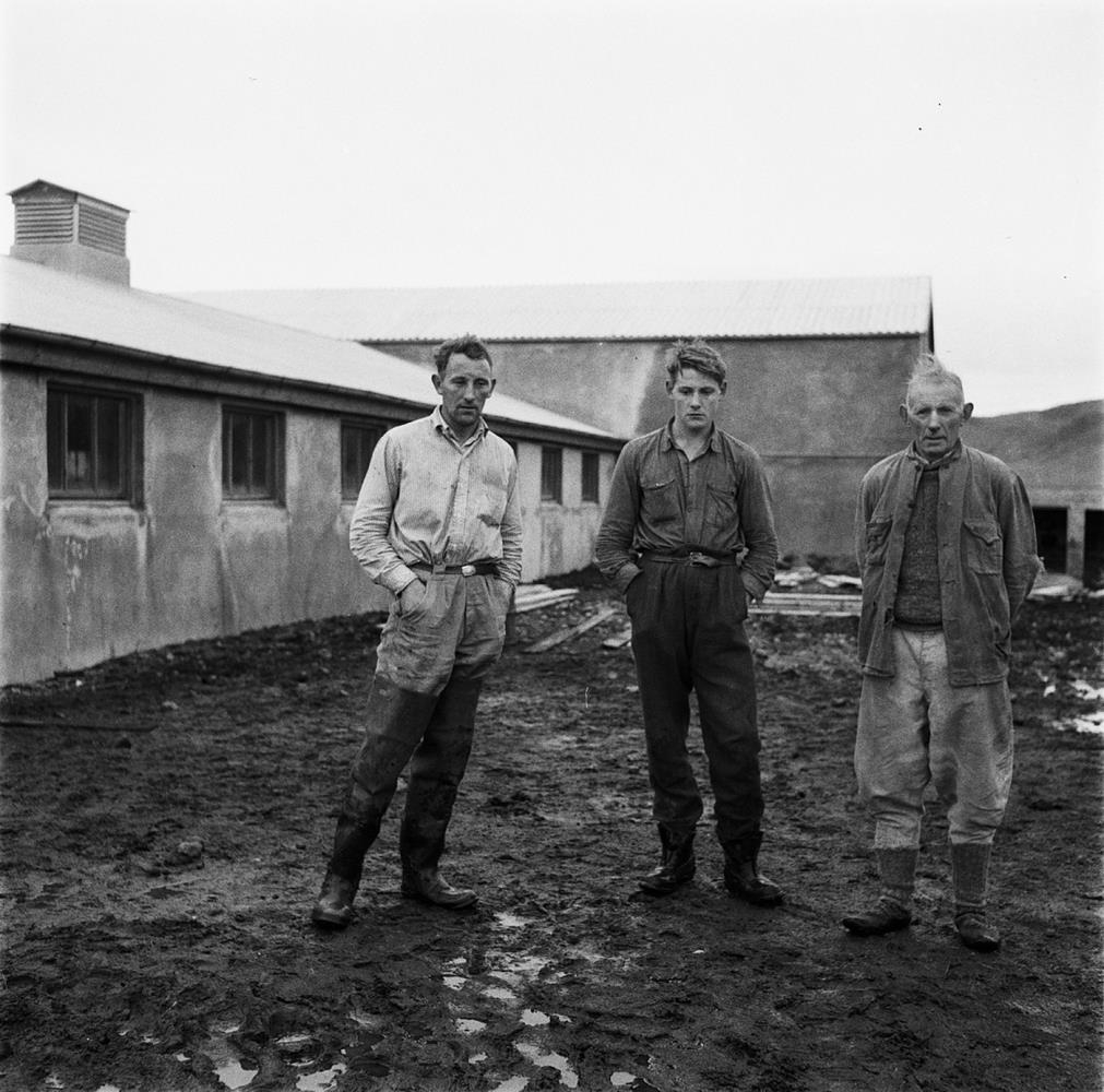 Nautaflatir. Ölfusi. Þrír menn í vinnufötum og stígvélum standa við nýbyggt fjós. Skúli Pétursson, Eyjólfur Pétursson og Pétur Þorbergsson. Sjá Tíminn 25.4.1954. Heimildamaður Kristinn Kristjánsson fyrrum skólastjóri. Nýbýli stofnað af Landnámi ríkisins undir Ingólfsfjalli.