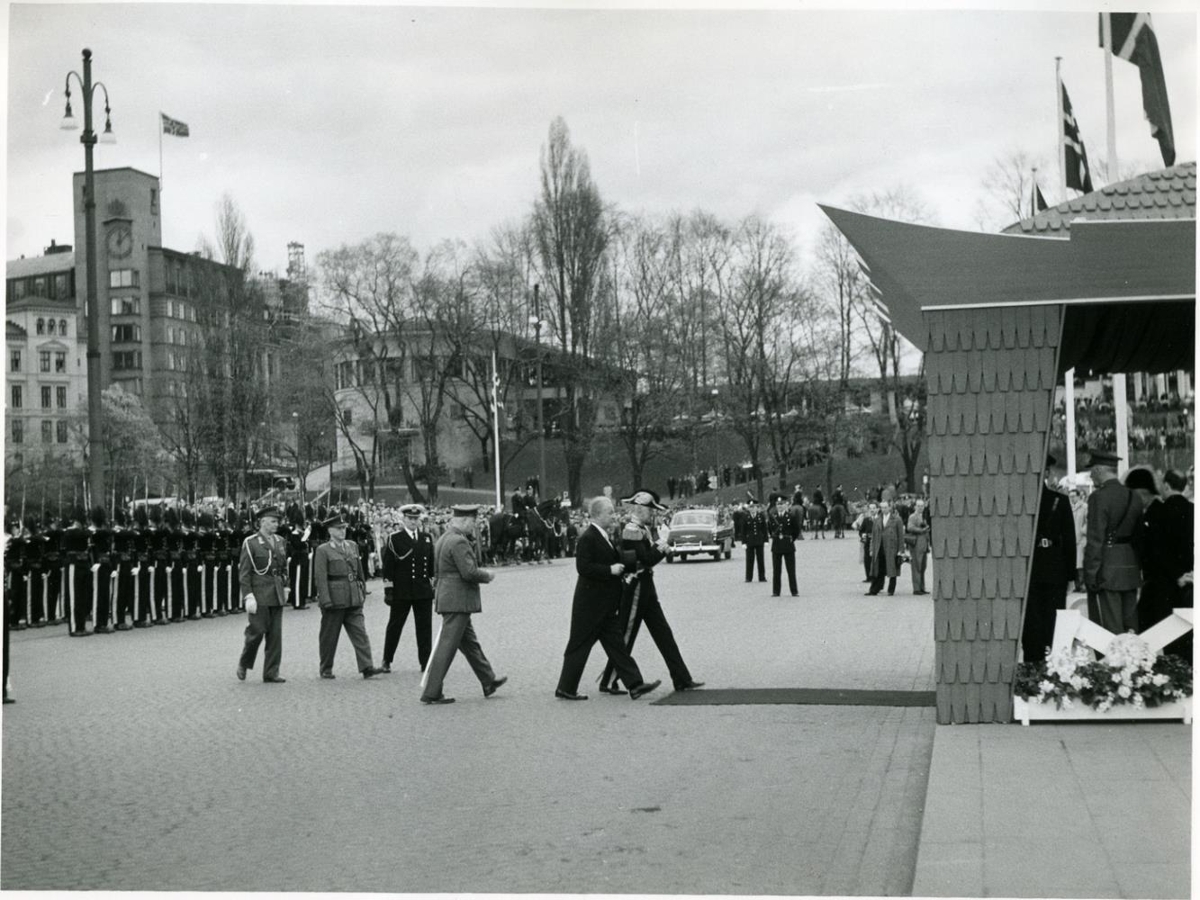 Úr forsetatíð Ásgeirs Ásgeirssonar. Ásgeir Ásgeirsson forseti og Håkon VII. Noregskonungur eftir að hafa kannað lífvörð Noregskonungs, líklega á Stórtorginu í Osló.