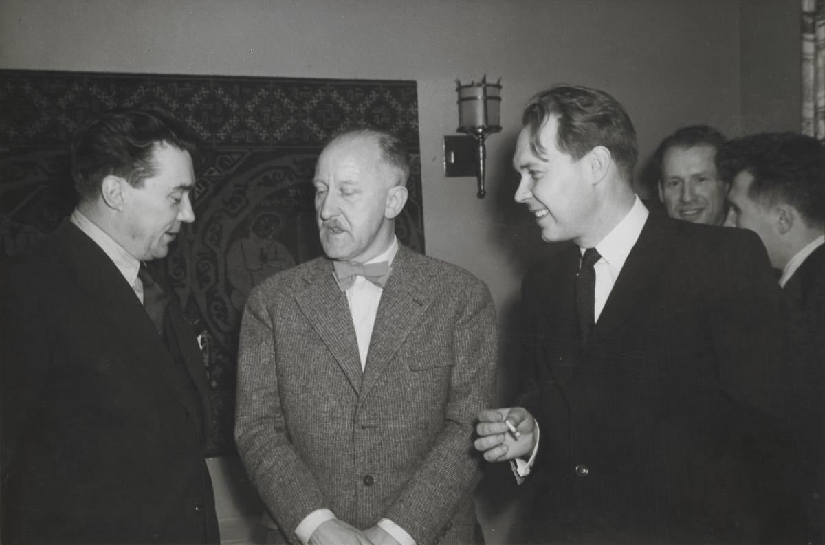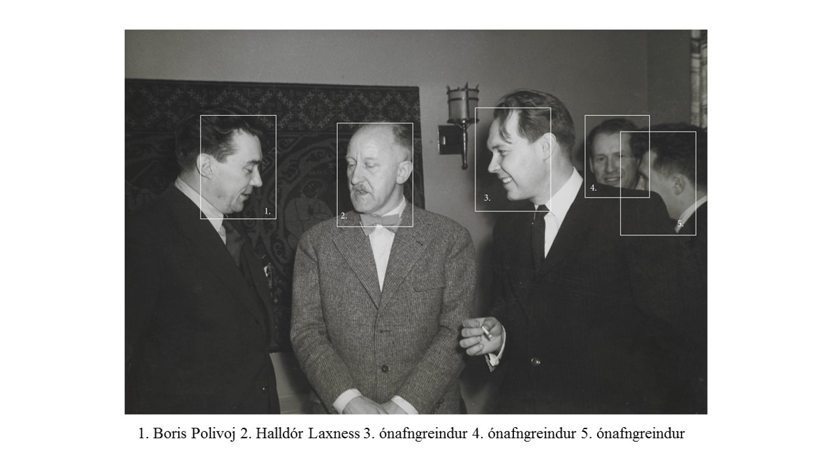 Myndin er tekin í veislu á Gljúfrasteini í maí árið 1953 en þá var þriðja sendinefndin frá Sovétríkjunum stödd á Íslandi.