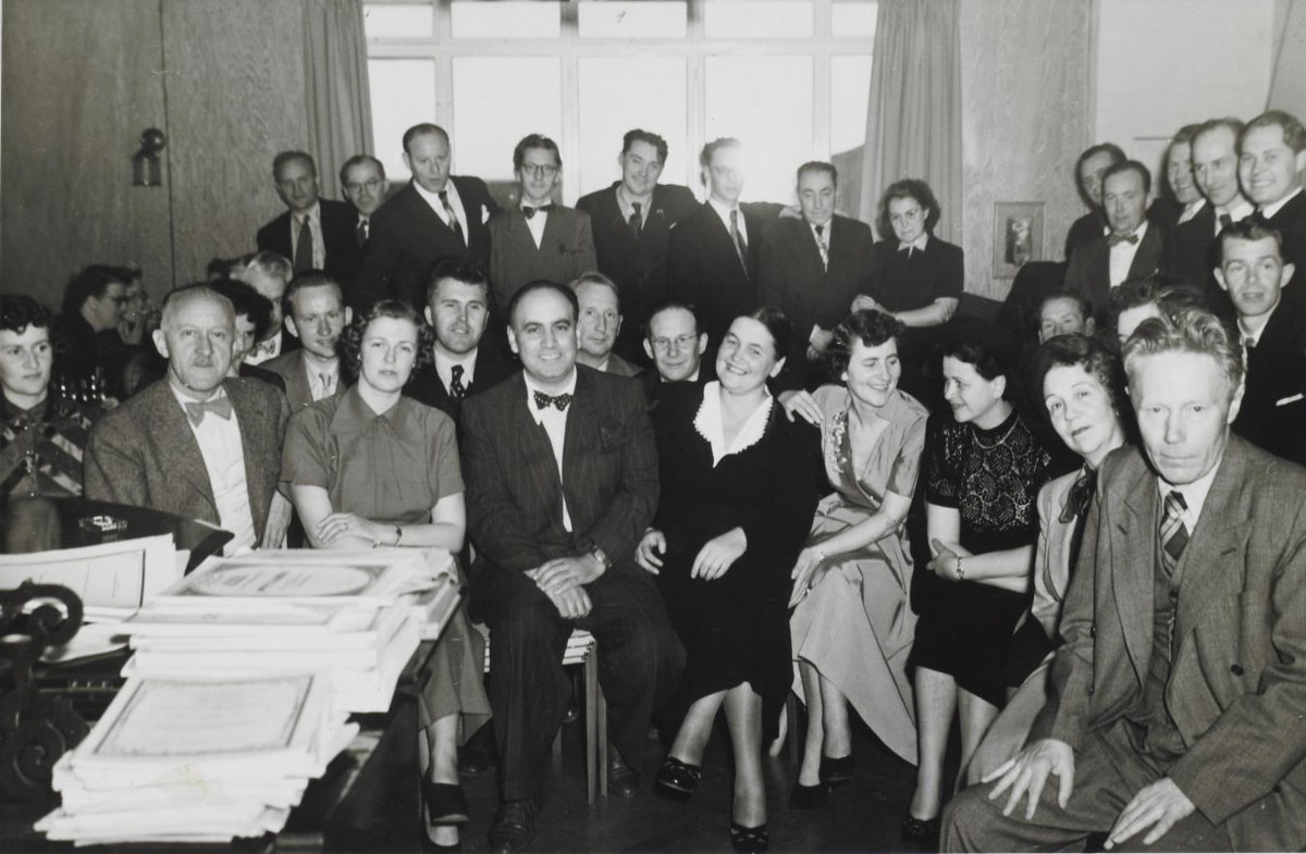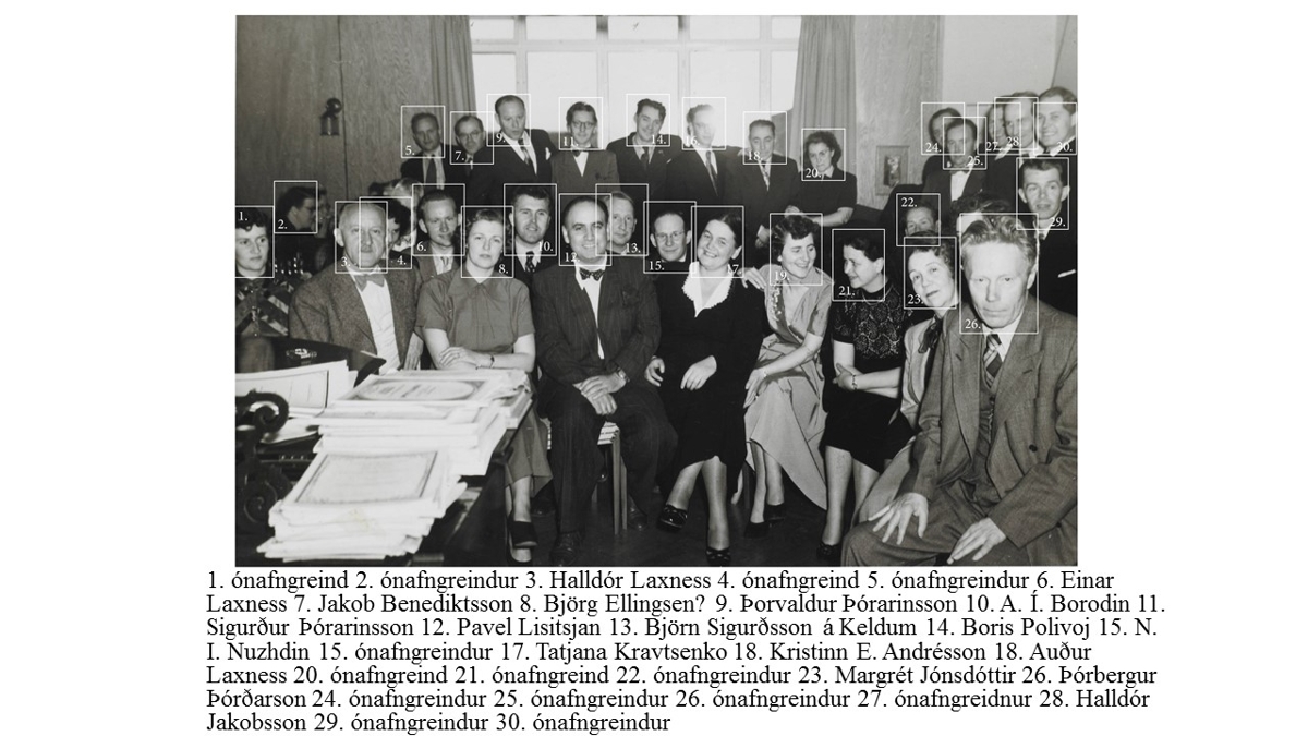 Hópmynd af gestum á Gljúfrasteini í maí 1953 en þá héldu óperusöngvarinn Pavel Lisitsjan og píanóleikarinn Tatjana Kravtsenko tónleika á Gljúfrasteini.
