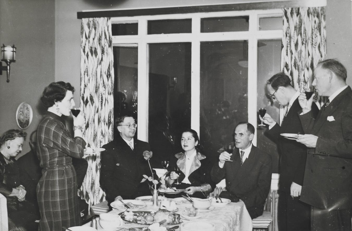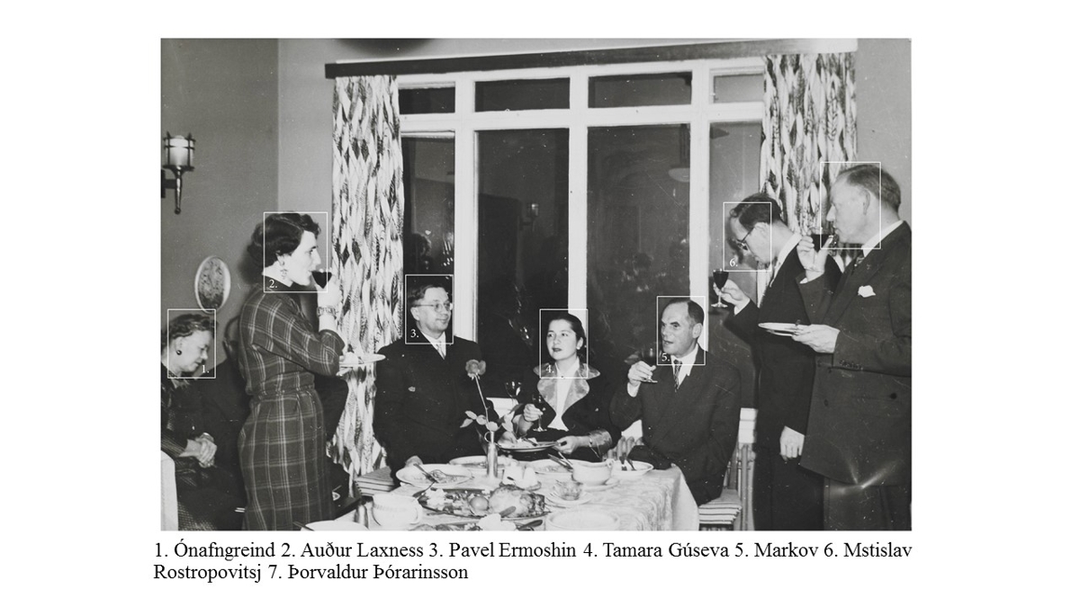 Gestir skála í borðstofunni á Gljúfrasteini eftir að Tamara Guseva lék á flygilinn. Á myndinni er einnig Mstislav Rostropovitsj sellóleikari. Hann hafði gleymt sellóinu uppi á hóteli og lék því ekki á Gljúfrasteini.