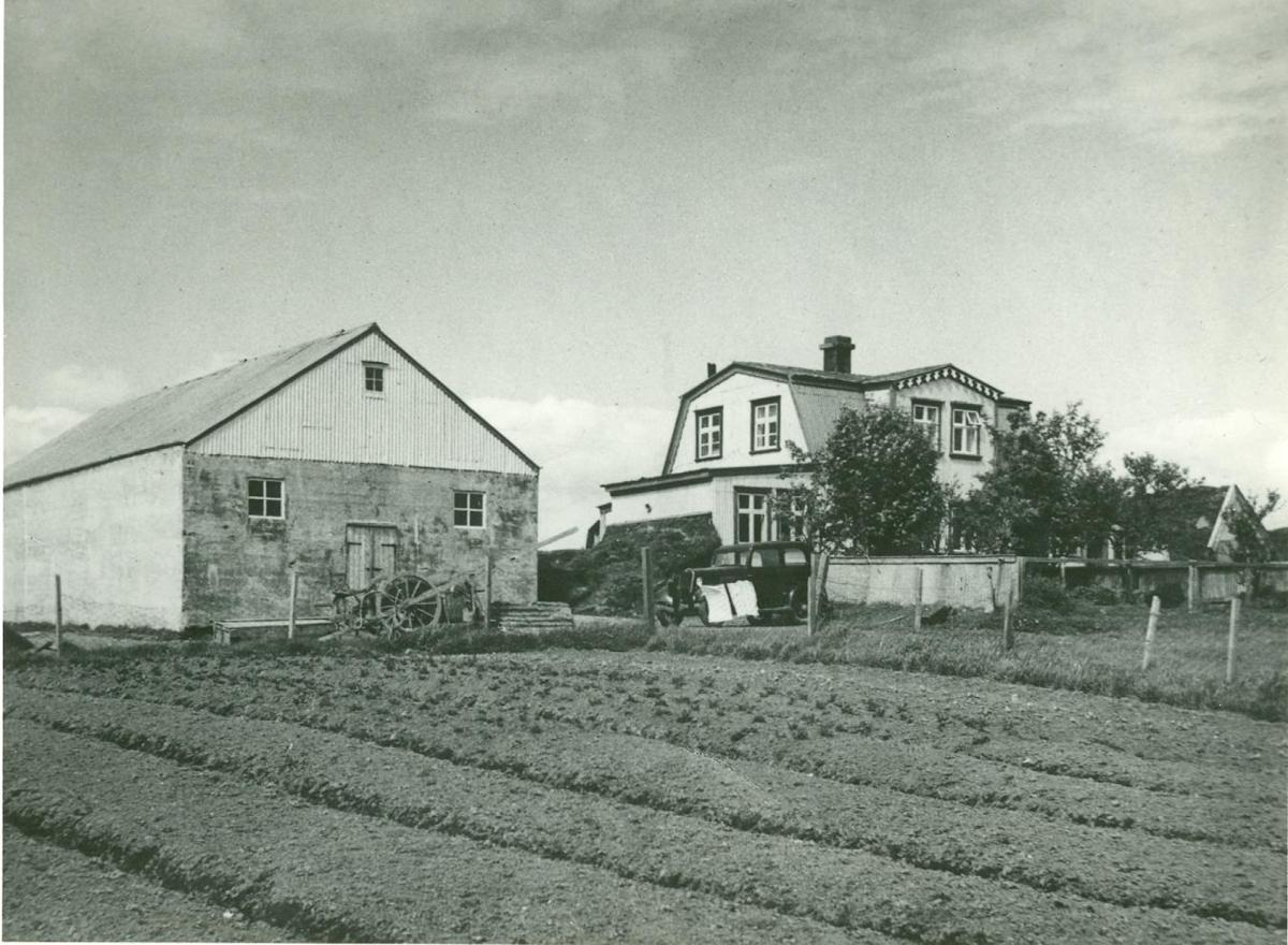 Sér heim að bæ. Kartöflugarður í forgrunni. Útihús, líklega skemma, og íbúðarhús með afgirtum garði með tjrám. Bíll við íbúðarhúsið. Vagn við skemmuna.