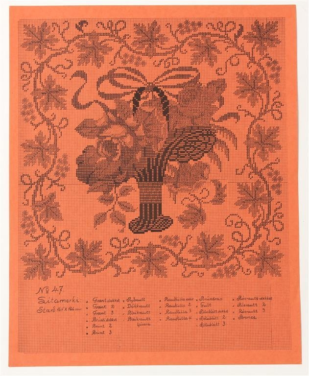 Útsaumsmunstur sem Karólína Guðmundsdóttir teiknaði upp og lét prenta. Hún seldi munstur ásamt útsaumsjafa og útsaumsgarni í Vefnaðarstofu sinni að Ásvallagötu í Reykjavík.