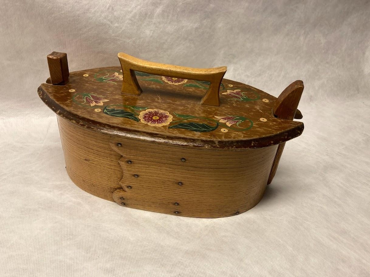 Rósamáluð tína, að venju sporöskjulaga. Hald (yngra) er á loki. Á aðra hlið er letrað MG 1862. Lakkáferð er utan á tínunni. Þetta virðist útlendur gripur. Mattildur var vinnukona hjá Árna Gíslasyni sýslumanni á Kirkjubæjarklaustri árin 1860-1872. Ég (Þ.Tómasson) geri því skóna að Árni hafi pantað tínuna frá Danmörku. Hún er forkunnar vel varðveitt miðað við aldur. Gripir frá langömmu gefenda; Matthildi Guðmundsdóttur ljósmóður á Dyrhólum í Mýrdal (f. 1847 d. 1937). Ragnheiður Þorsteinsdóttir amma Sólveigar var dóttir Matthildar.