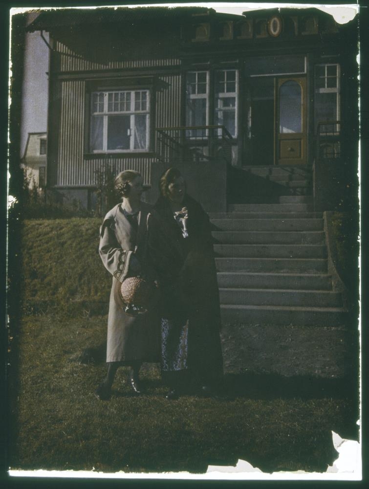 Tvær konur standa í garði neðan við tröppur upp að timburhúsi.
