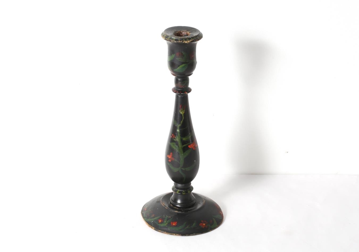 Renndur kertastjaki og málaður svartur í grunninn og síðan málaðar á hann rauðar rósir með grænum blöðum og vafningum. Ekki vitað hvað stjakinn er gamall.