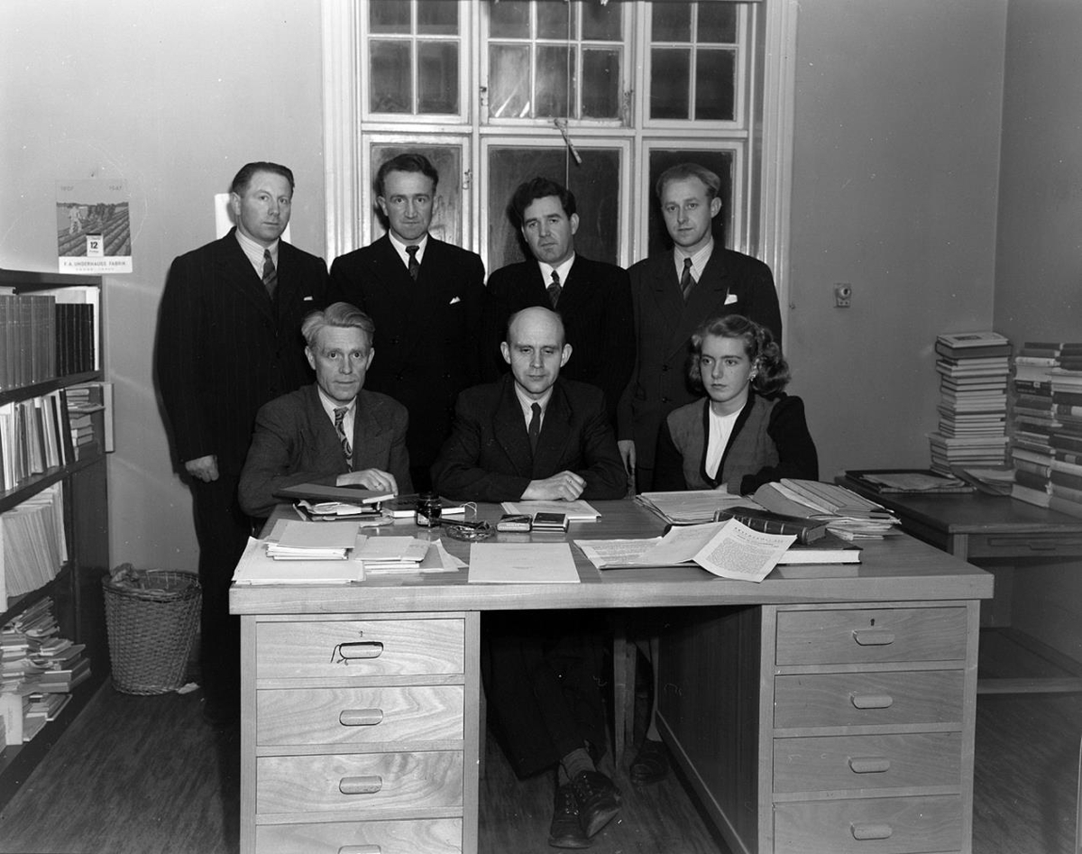 Hópur fólks uppstilltur bak við skrifborð. Efri röð: Eyjólfur Jónsson, Jónas ?, Þorleifur Þórðarson og Vilhjálmur Árnason. Neðri röð: Sveinbjörn Sigurjónsson, Jón Magnússon og óþekktur. Skrifstofa SÍS?
