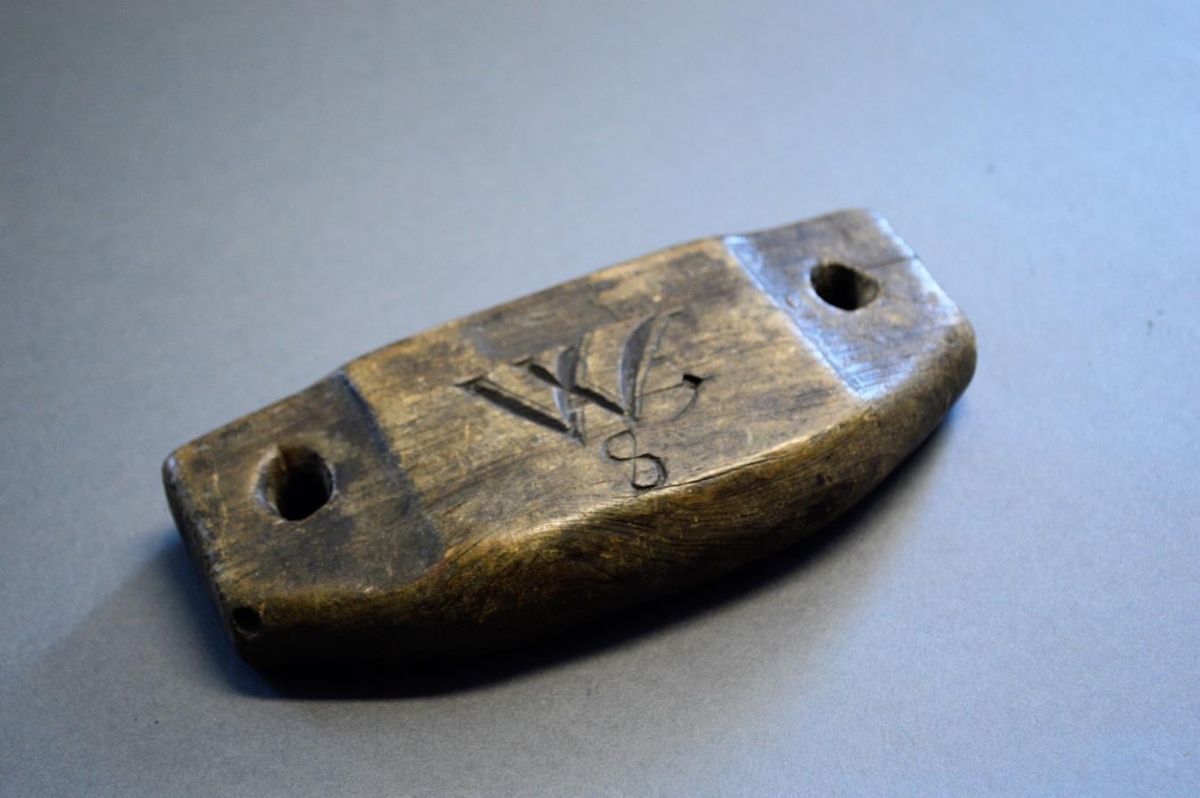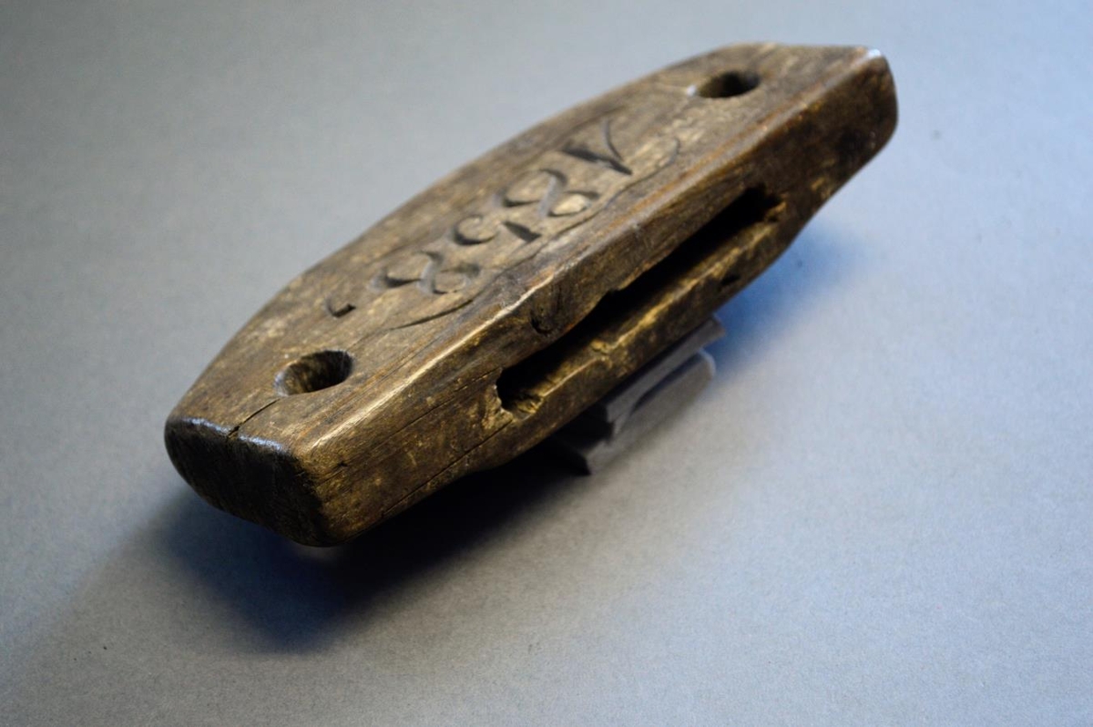 Eftirlíking af axarslíðri fyrir litla bólöxi. Þannig axir voru notaðar í fjöruferðum t.d. Er íbjúgt í aðra hlið. Axarholið er 9x2 cm. Tvö göt og eignarmark VV= E.E. Gert eftir axarslíðri Einars Einarssonar bónda á Strönd, en það er glatað. Loftur man það vel, svo og Þórður sem handlék það á Strönd.