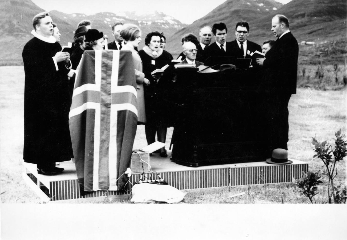 Bændadagur í Öxnadal við Jónasarlund. Séra Bolli Gústavsson lengst til hægri með sálmabók.