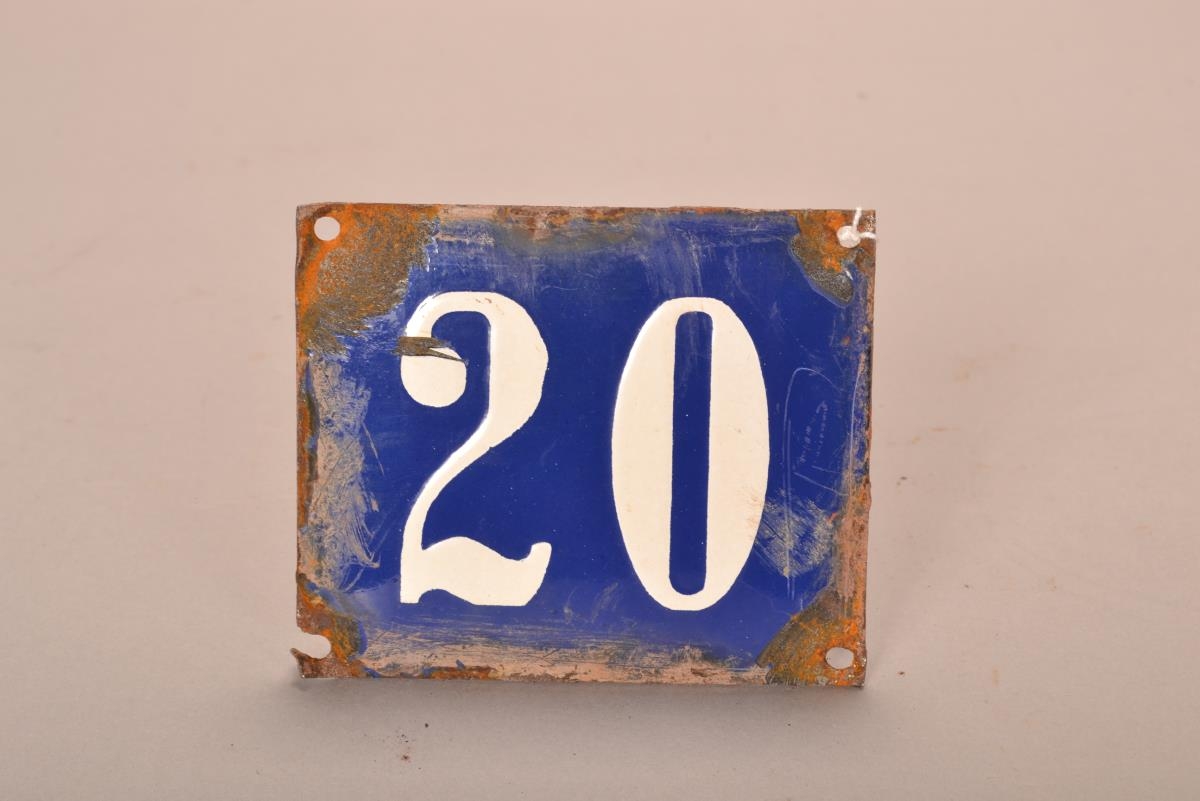 Húsnúmeraskilti úr málmi, blátt með hvítum stöfum, merkt „20“