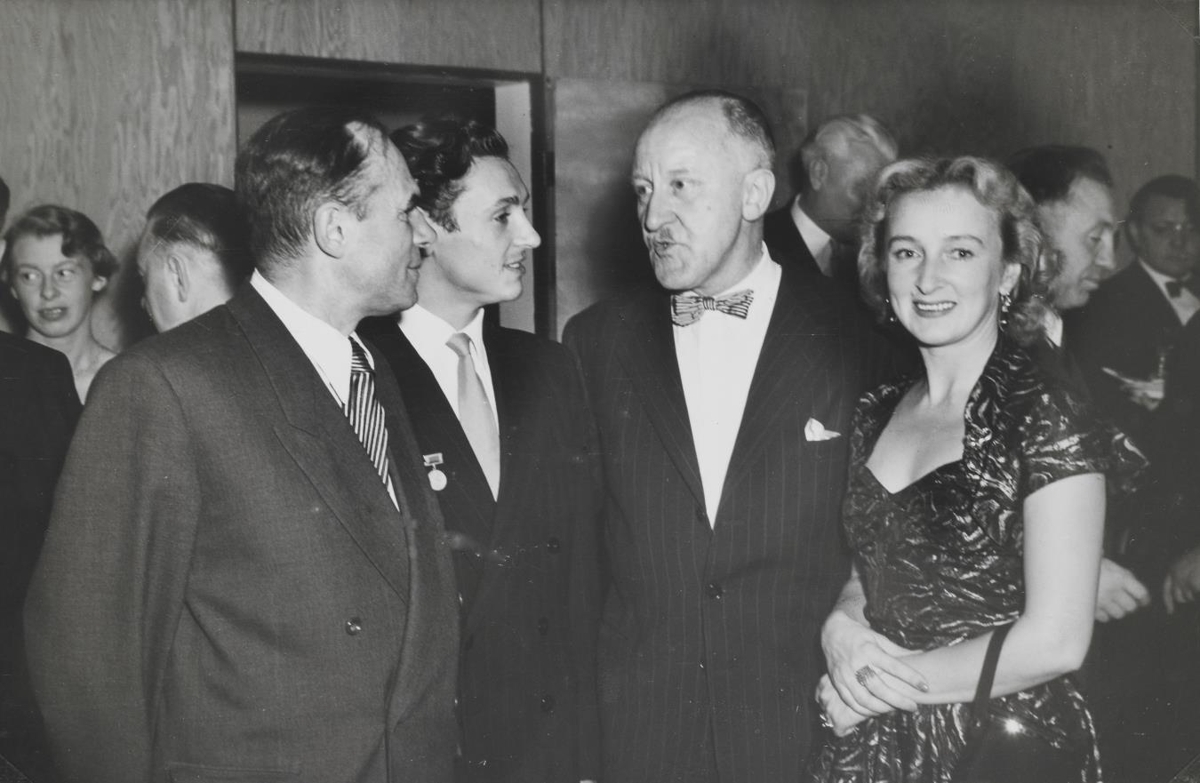 Ljósmynd úr samkvæmi á Gljúfrasteini frá árinu 1954. Á henni má sjá Halldór Laxness og Pavel Makarov ásamt ónafngreindu fólki. Fyrir aftan ljóshærðu konuna má sjá Gísla Ásmundsson. Samkvæmið var haldið í tilefni komu fjórðu sovésku sendinefndarinnar.