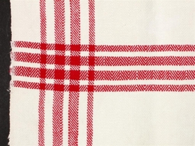 Viskustykki, hvítt með íofnum rauðum röndum. Á miðu beggja skammhliða eru saumuð bönd til að hengja það upp.