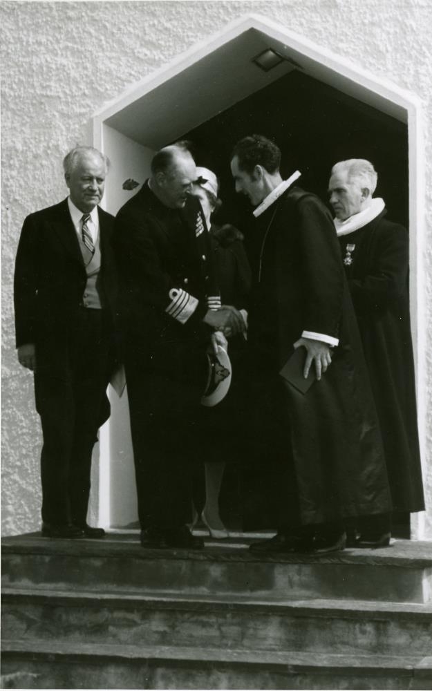 Ólafur V. Noregskonungur heilsar Sigurbirni Einarssyni biskupi á tröppum Bessastaðakirkju. Ásgeir Ásgeirsson forseti t.v. og óþekktur prestur fylgist með.