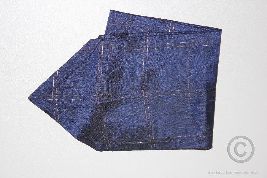 Slifsi úr þunni bláu nælonefni með gylltum þráði sem myndar ferninga í efnið. Endarnir eru oddlaga og brúnir eru vélsaumaðar með sik sak saumi. Munur með safnnúmer 2005-12-2, svunta, er úr samskonar efni og tilheyrir slifsinu. Ekki er vitað með vissu hver átti þetta slifsi en trúlega hefur það annað hvort verið Sesselja Eldjárn eða systir hennar Ingibjörg. Þær voru föðursystur Kristjáns Eldjárn forseta. Gefendur eru frændsystkini systranna og var slifsið í vörslu Petrínu Soffíu Eldjárn móður þeirra.