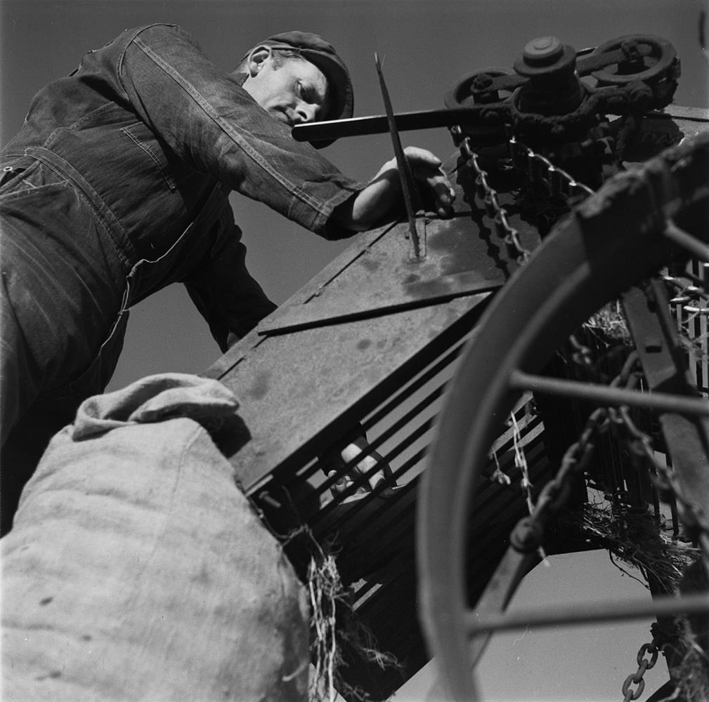 Þykkvibær. Maður í vinnugalla stendur við kartöfluupptökuvél sem sekkja kartöflurnar. Sigurbjartur Guðjónsson bóndi og oddviti í Hávarðarkoti við kartöfluupptekt í Borgartúnsnesi í Þykkvabæ haustið 1954. Sjá Tíminn 3. Október 1954.