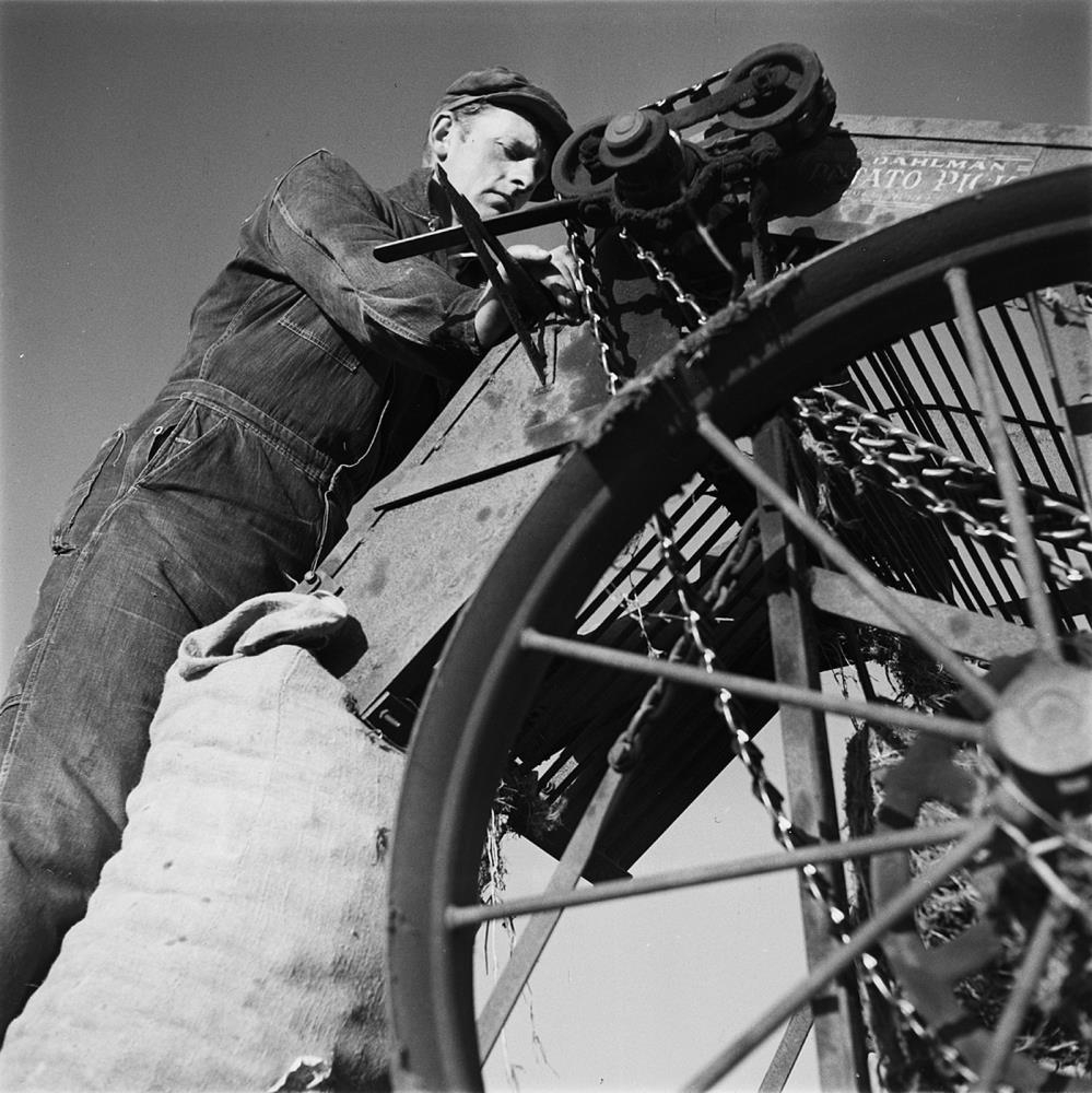Þykkvibær. Nærmynd af vélarhluta af upptökuvél og manni sem er að vinna við hana. Sekkur með kartöflum. Sigurbjartur Guðjónsson bóndi og oddviti í Hávarðarkoti. 1954.