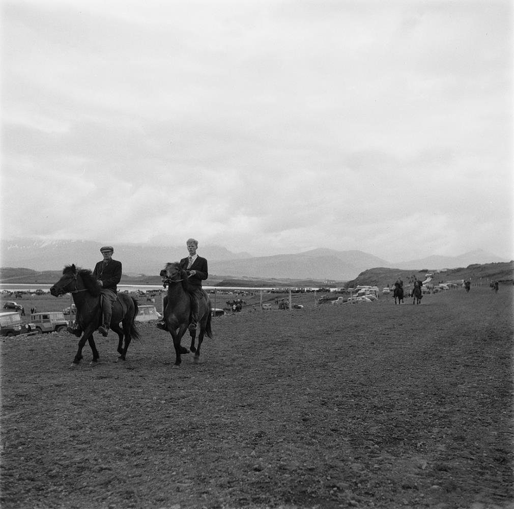 Faxaborg. Ferjukot. Borgarhreppur. Tveir menn koma ríðandi eftir braut. Bílar neðan við hana og fleiri koma ríðandi fjær. Hestamannamót hestamannafélagsins Faxa. Feðgarnir frá Arnþórsholti. Magnús Sigurðsson og Guðmundur Magnússon. 1953. Heimildamaður Árni Guðmundsson frá Beigalda.