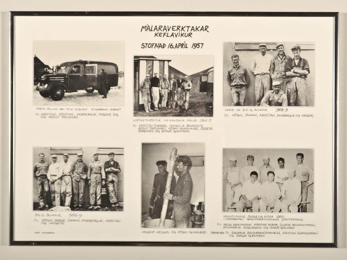 Sex svart/hvítar ljósmyndir saman í ramma af málurum hjá Málaraverktökum við störf.