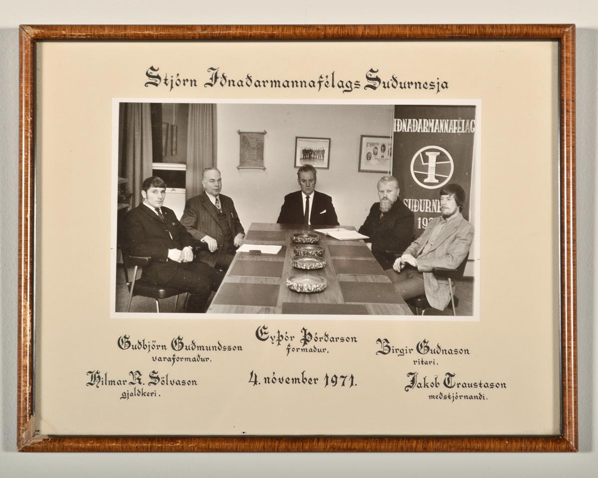 Innrömmuð svart/hvít ljósmynd af stjórn Iðnaðarmannafélags Suðurnesa 4. nóvember 1971: „Eyþór Þórðarson, formaður, Guðbjörn Guðmundsson, varaformaður, Birgir Guðnason, ritari, Hilmar R. Sölvason, gjaldkeri og JakobTraustason, meðstjórnandi.“