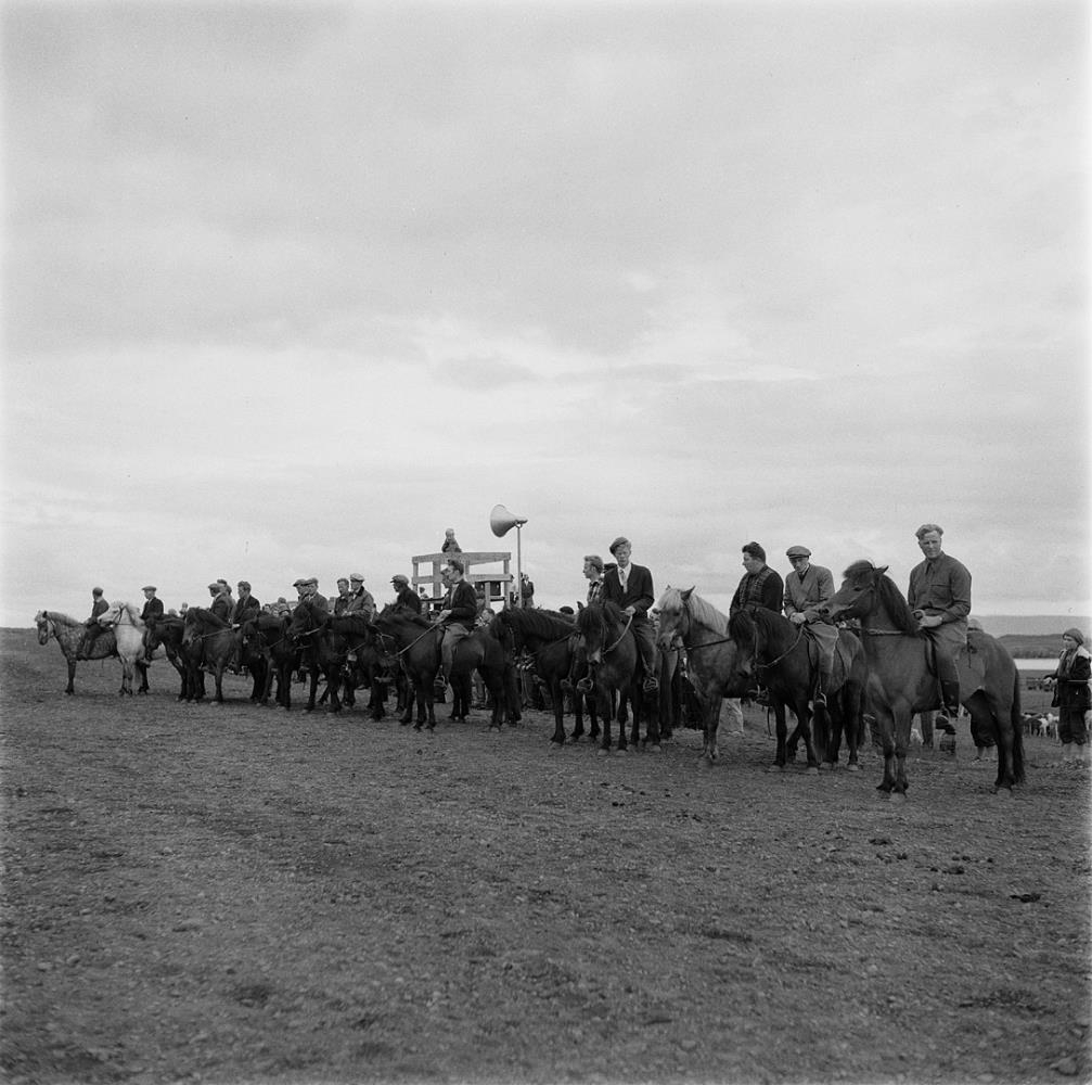 Faxaborg. Ferjukot. Borgarhreppur. Röð hesta og mann uppstillt framan við timburpall sem hátalari er yfir. Kristján Davíðsson Oddsstöðum, Þorgeir Þorsteinsson Grund, Ragnar Olgeirsson Oddsstöðum, Guðmundur Magnússon Arnþórsholti. Aðrir óþekktir. Hestamannamót hestamannafélagsins Faxa. 1953. Heimildamaður Árni Guðmundsson frá Beigalda.