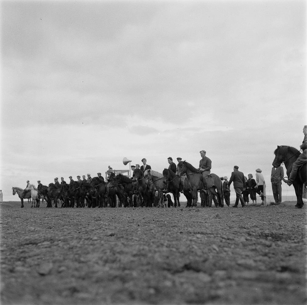 Faxaborg. Ferjukot. Borgarhreppur. Röð hesta og mann uppstillt framan við timburpall sem hátalari er yfir. Kristján Davíðsson Oddsstöðum, Þorgeir Þorsteinsson Grund, Ragnar Olgeirsson Oddsstöðum, Guðmundur Magnússon Arnþórsholti. Aðrir óþekktir. Til hægri Ari Guðmundsson á Skugga. Hestamannamót hestamannafélagsins Faxa. 1953. Heimildamaður Árni Guðmundsson frá Beigalda.