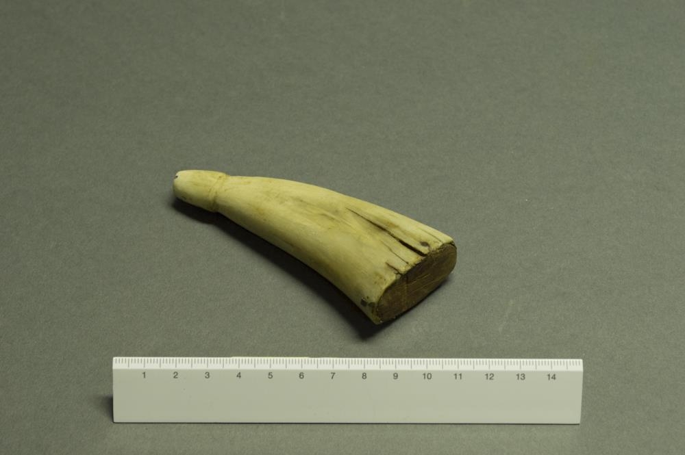 Lítill baukur úr ljósleitu horni. Botn sem er úr við er heill. Botn er negldur við baukinn. Sprungur í hliðum