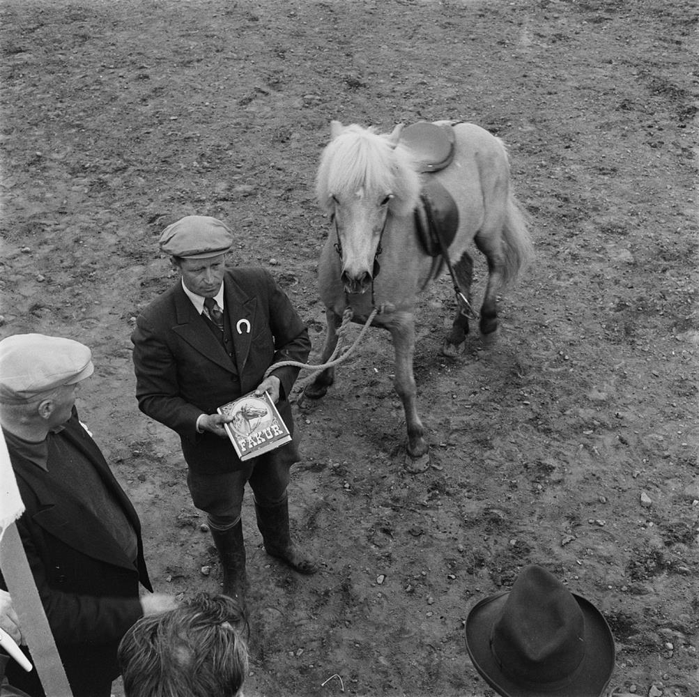 Faxaborg. Ferjukot. Borgarhreppur. Maður með bók í hendi heldur í taum á hesti framan við menn. Marinó Jakobsson á Skaney heldur í gæðinginn Glað sem vann góðhestakeppnina 1953 og hlaut Faxaskeifuna. Bogi Eggertsson frá Laugardælum með hvíta húfu. á hestbaki talar í hátalara. Strákar í bakgrunni. Ari Guðmundsson Borgarnesi á stóðhestinum Skugga 201 ávarpar mótsgesti af hestbaki. Hestamannamót hestamannafélagsins Faxa. 1953. Heimildamaður Árni Guðmundsson frá Beigalda.