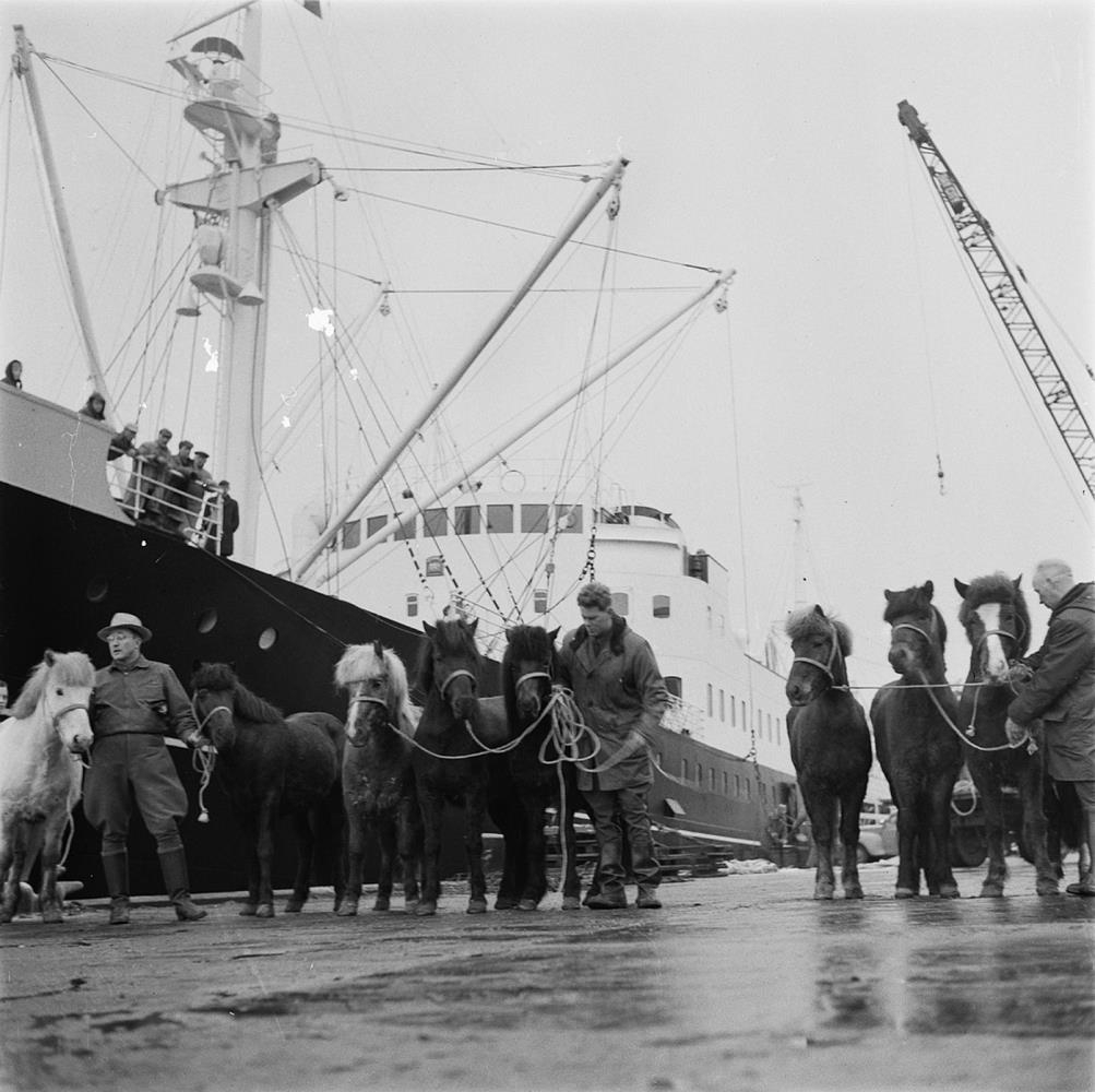 Reykjavíkurhöfn. Átta hestar standa við skipshlið á flutningaskipi. Þrír menn halda í tauma hestanna. Útflutningur hesta til Skotlands á tamningastöð. Gunnar Bjarnason ráðunautur, Þorkell Bjarnason frá Laugarvatni og Páll Sigurðsson í Fornahvammi halda í tauma hestanna. 1954.
