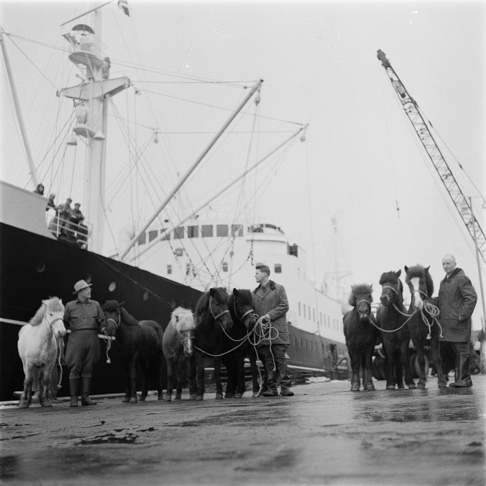 Reykjavíkurhöfn. Átta hestar standa við skipshlið á flutningaskipi. Þrír menn halda í tauma hestanna. Útflutningur hesta til Skotlands á tamningastöð. Gunnar Bjarnason ráðunautur, Þorkell Bjarnason frá Laugarvatni og Páll Sigurðsson í Fornahvammi halda í tauma hestanna. 1954.
