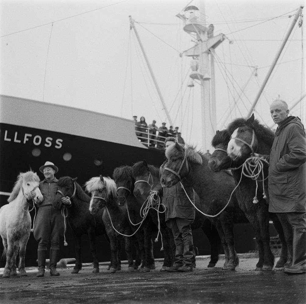 Reykjavíkurhöfn. Átta hestar standa við skipshlið á flutningaskipi með áletruninni GULLFOSS. Þrír menn halda í tauma hestanna. Útflutningur hesta til Skotlands á tamningastöð. Gunnar Bjarnasonráðunautur, Þorkell Bjarnason frá Laugarvatni og Páll Sigurðsson í Fornahvammi halda í tauma hestanna. 1954.