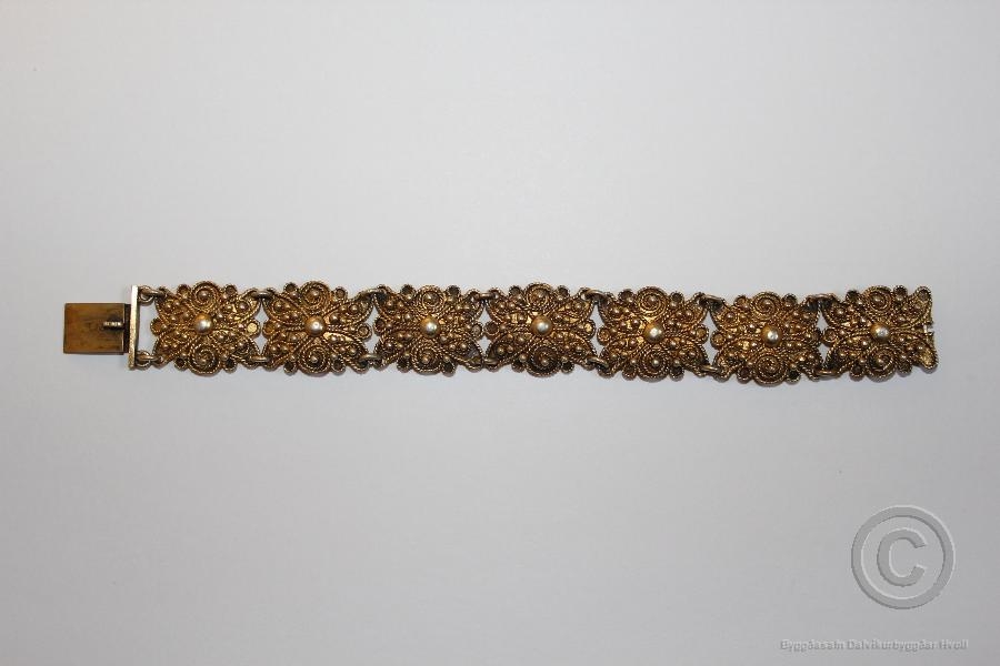 Armband úr silfri með gyllingu. Í því eru 7 víravirkishlekkir. Í það er stimplað "GHG" sem stendur fyrir Guðmund Helga Guðnason gullsmið, 1884-1953. Einnig er stimplað í "925".