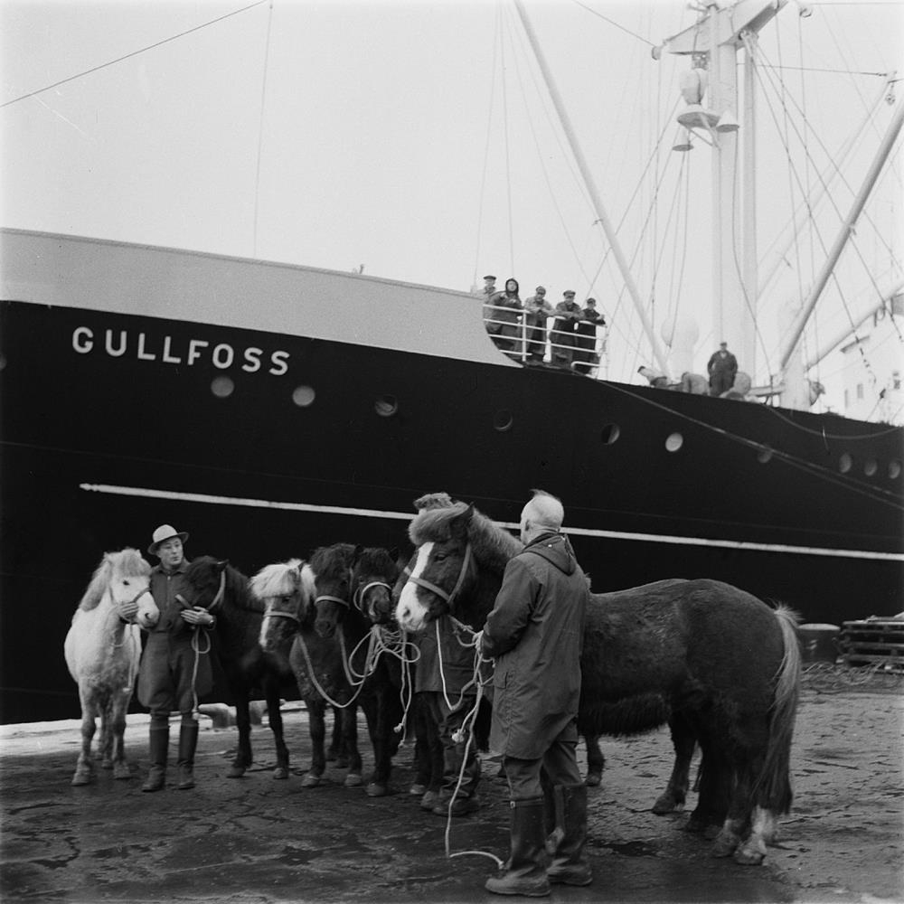 Reykjavíkurhöfn. Átta hestar standa við skipshlið á flutningaskipi með áletruninni GULLFOSS. Þrír menn halda í tauma hestanna. Útflutningur hesta til Skotlands á tamningastöð. Gunnar Bjarnason ráðunautur, Þorkell Bjarnason frá Laugarvatni og Páll Sigurðsson í Fornahvammi halda í tauma hestanna. 1954.