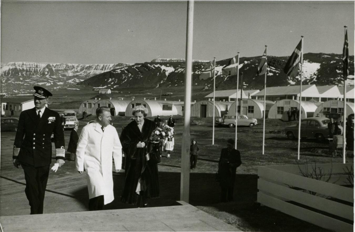 Konungshjónin dönsku í heimsókn hjá vinnuheimili SÍBS á Reykjalundi í Mosfellssveit. Oddur Ólafsson yfirlæknir fylgir konungshjónunum um staðinn.