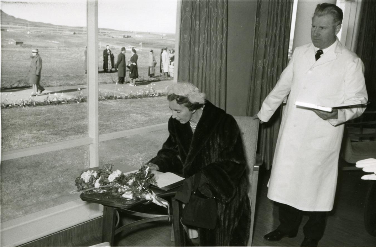 Konungshjónin dönsku í heimsókn hjá vinnuheimili SÍBS á Reykjalundi í Mosfellssveit. Gestirnir rita nöfn sín í gestabók.