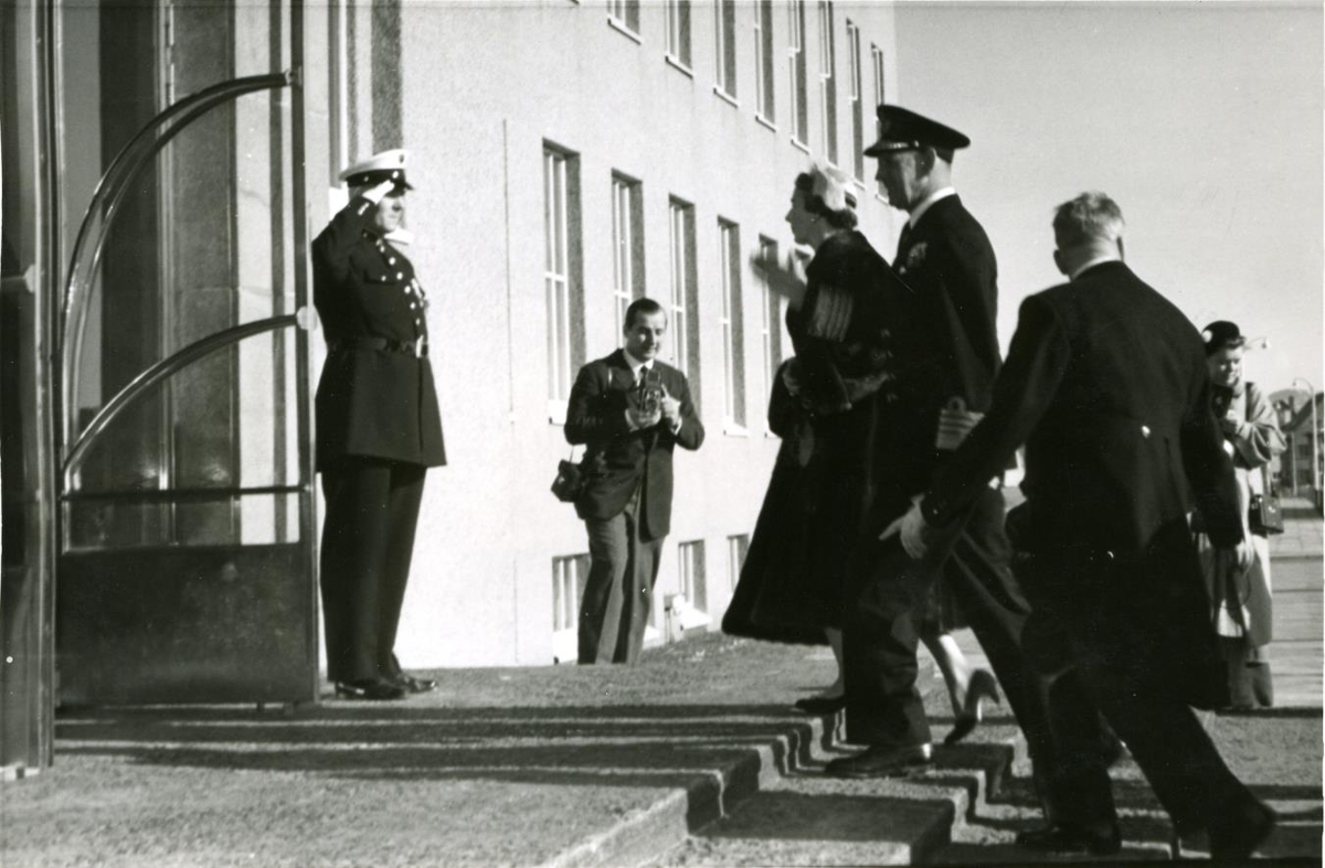 Konungshjónin dönsku ásamt forsetahjónunum í heimsókn í Háskóla Íslands. Friðrik IX. og Ingiríður drottning ganga inn um aðaldyr Háskólans.