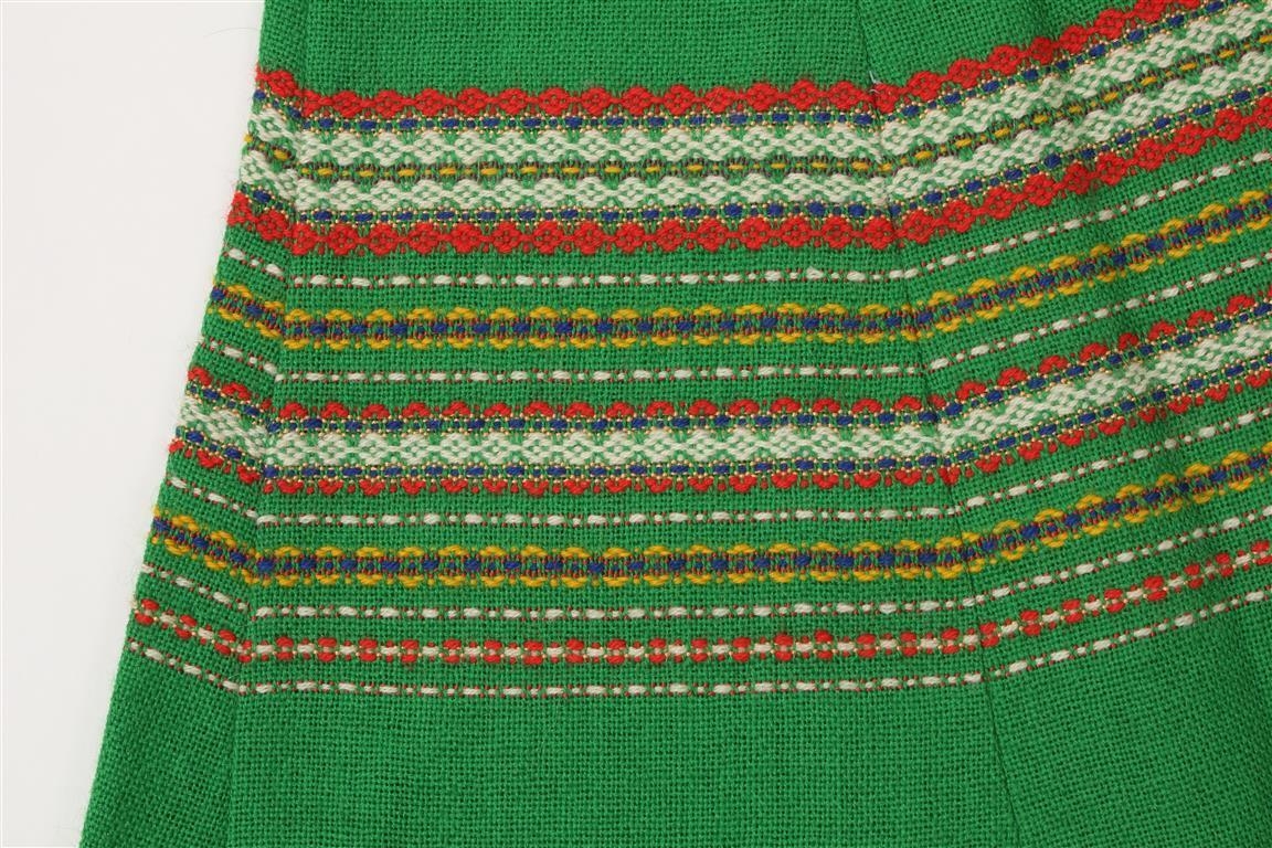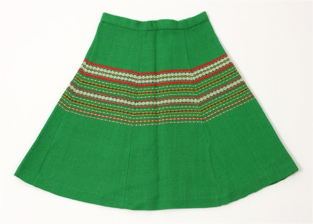 Grænt hringskorið pils. Með marglitum munsturbekk. Samsett úr sex stykkjum. Opið á hlið, tekið saman með tveimur krækjum. Framan á strenginn var heftur verðmiði „975/“.