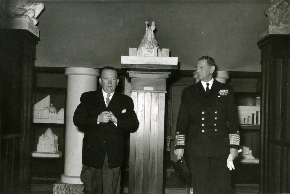 Konungshjónin dönsku ásamt forsetahjónunum í heimsókn í Listasafni Einars Jónssonar. Gestirnir skoða safnið og listaverkin þar; Hörður Bjarnason húsameistari ríkisins og Friðrik IX.