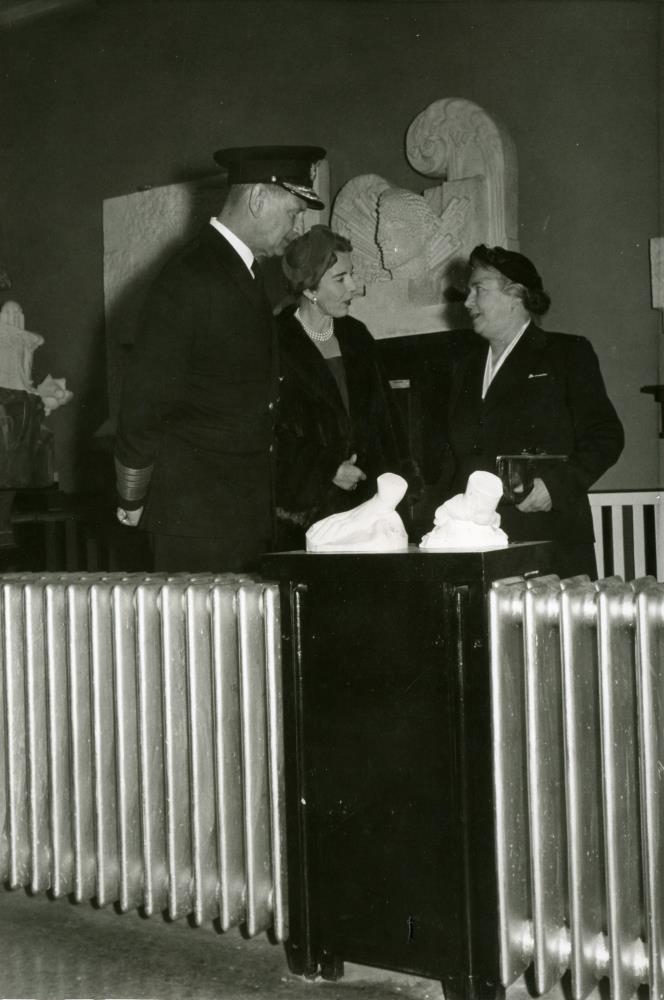 Konungshjónin dönsku ásamt forsetahjónunum í heimsókn í Listasafni Einars Jónssonar. Gestirnir skoða safnið og listaverkin þar; Friðrik IX. og Ingiríður drottning ræða við Önnu Jónsson.