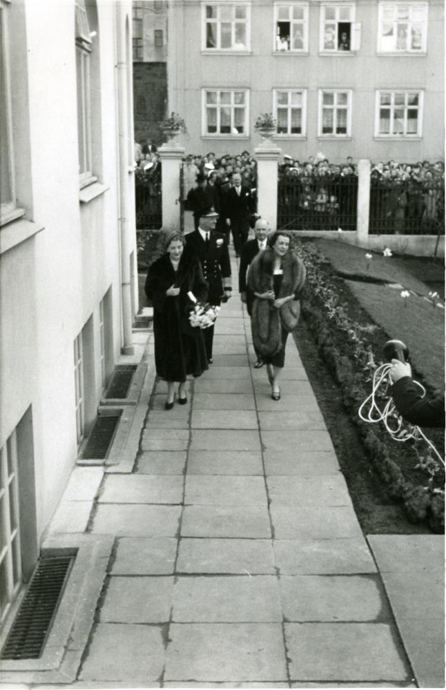 Konungshjónin dönsku ásamt forsetahjónunum í Danska sendiráðinu við Hverfisgötu. Fremst Ingiríður drottning t.v. og Bodil Bergtrup sendiherra t.h.