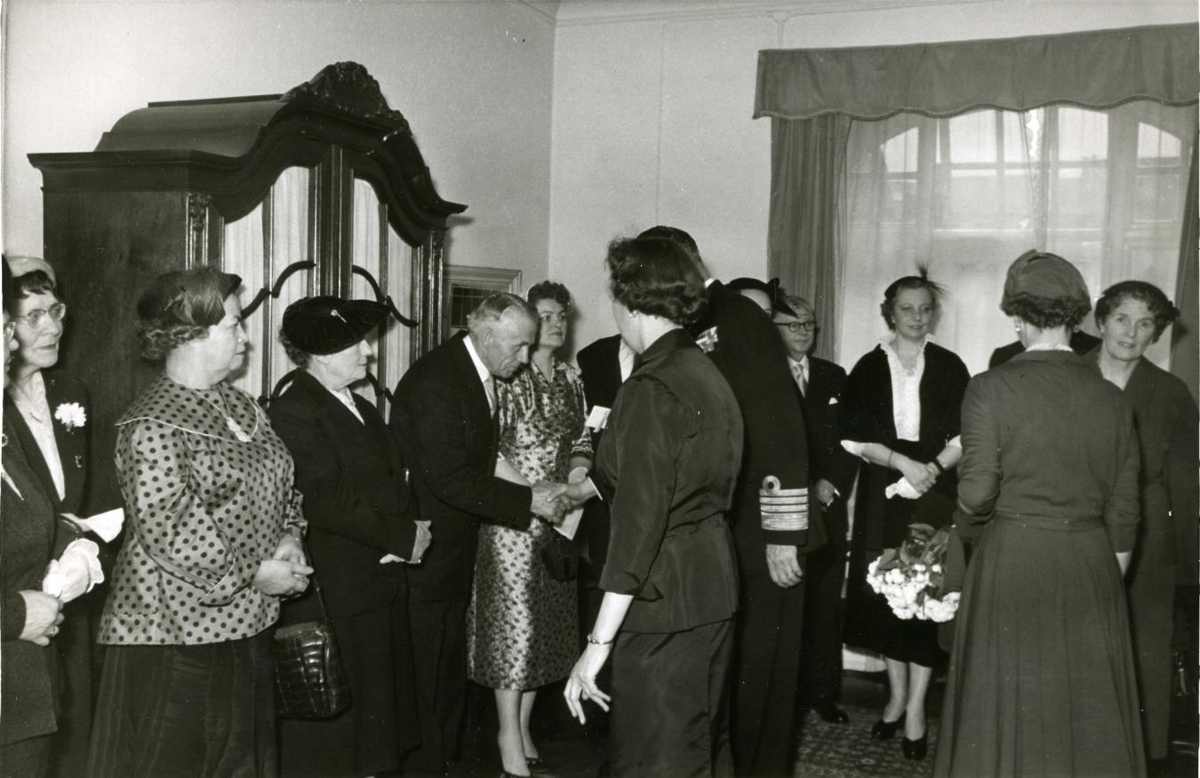 Konungshjónin dönsku ásamt forsetahjónunum í Danska sendiráðinu við Hverfisgötu; Bodil Bergtrup sendiherra, Friðrik IX. og Ingiríður drottning heilsa viðstöddum.