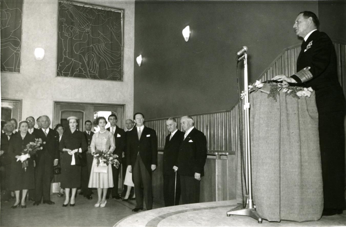 Konungshjónin dönsku ásamt forsetahjónunum í móttöku á vegum borgarstjóra Reykjavíkur í Melaskóla; Friðrik IX. konungur flytur ávarp.