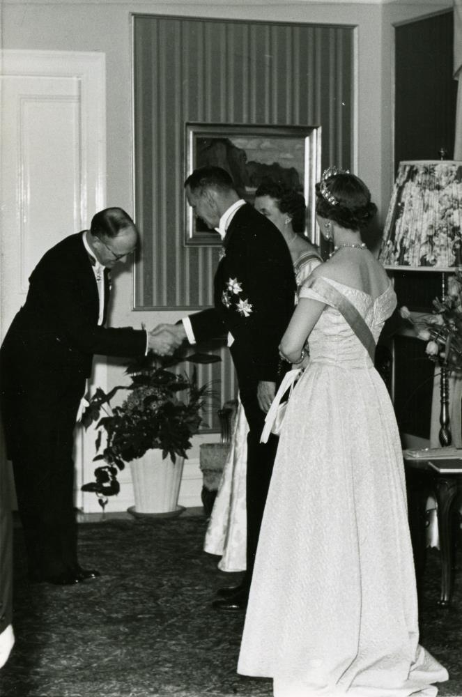 Konungshjónin dönsku ásamt forsetahjónunum í Ráðherrabústaðnum þar sem konungshjónin tóku á móti sendiherrum og sendifulltrúum erlendra ríkja hér á landi ásamt Bodil Bergtrup sendiherra.