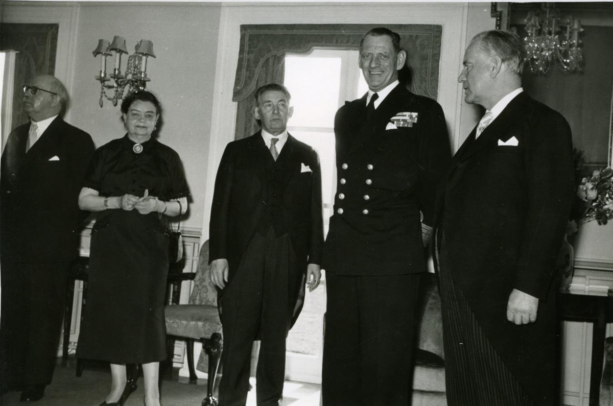 Konungshjónin dönsku ásamt forsetahjónunum og fylgdarliði í hádegisverði á Bessastöðum. Friðrik IX. og Ásgeir Ásgeirsson yst v.h.