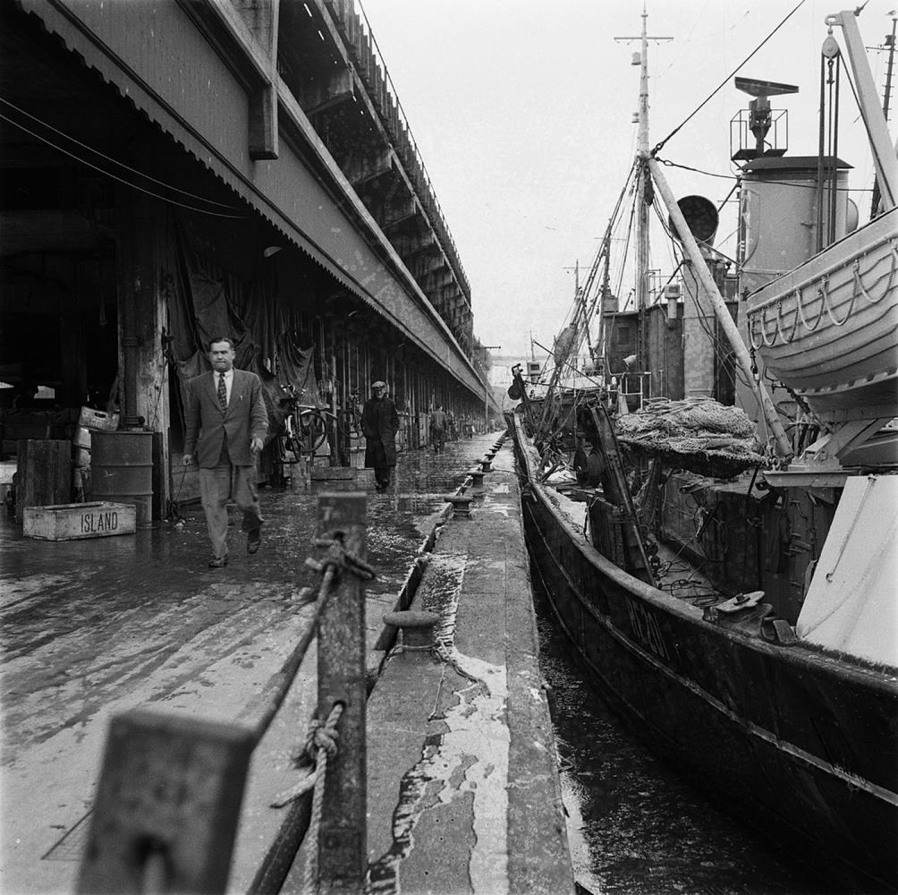 Grimsby. Englandi. Togari við bryggju. Menn á gangi á bryggjunni. Togarinn Ingólfur Arnarson. Október 1953.