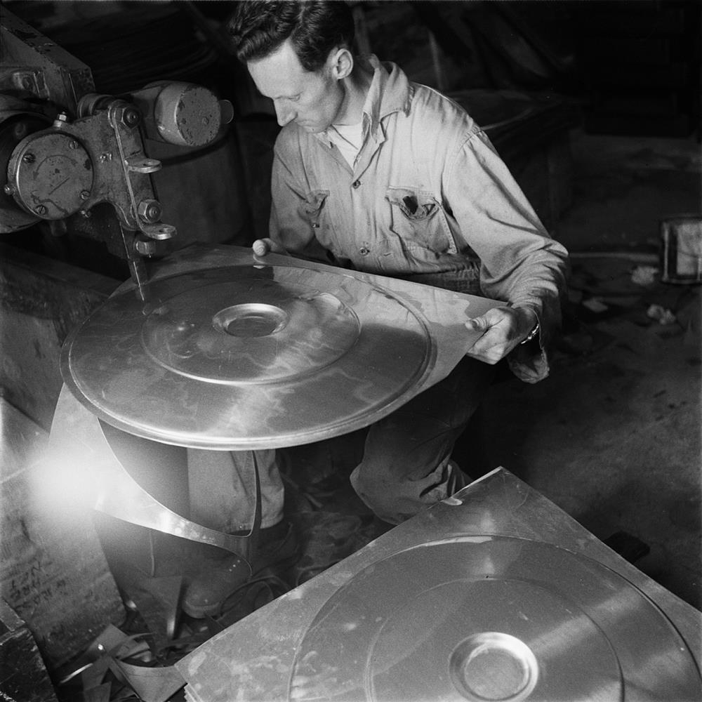 Rafha. Hafnarfirði. Maður að vinna við að móta stóra hringlaga plötu. Loka á þvottapotta eða þvottavélar. Eyþór?