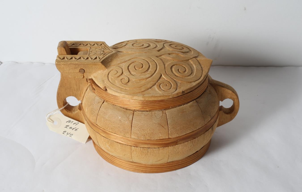 Stafaaskur úr 12 stöfum. Lokið er útskorið og á lokfestinguna er skorið ártalið 1968. Neðan á botni asksins er skrifað með kúlupenna: Til Gísla frænda Hallgrímssonar á Hallfreðastöðum með kærri kveðju G. Þorsteinsson frá Lundi. Askinn gerði Guðmundur Þorsteinsson sem kenndi sig við Lund í Lundarreykjadal í Borgarfirði.