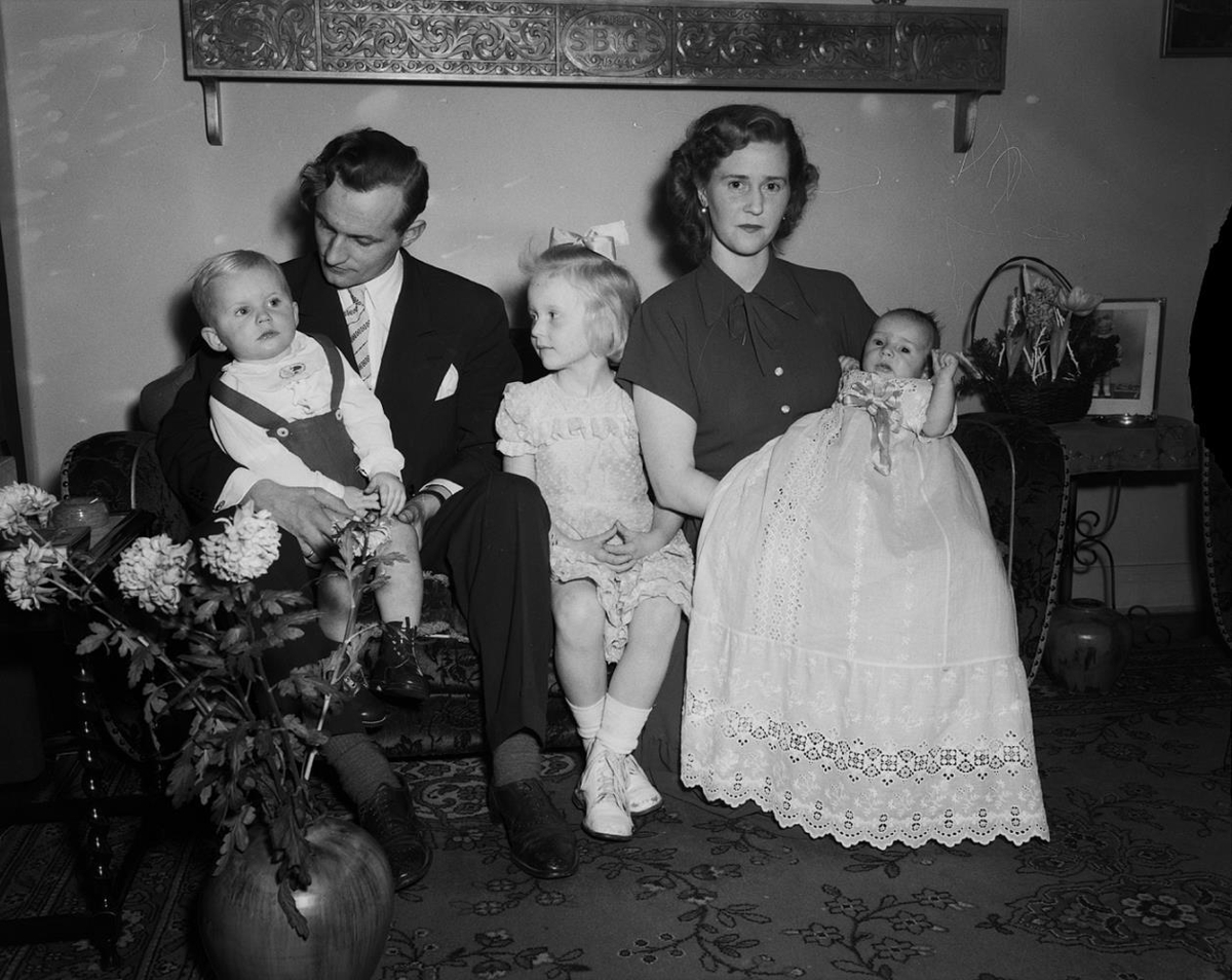 Hjón sitja með þrjú börn í sófa, eitt í skírnarkjól, í stofu. Útskorin hilla á bakvið sófann. Sigurður Benediktsson frá Húsavík og Guðrún Sigurðardóttir frá Veðramóti í Skagafirði með börn sín.