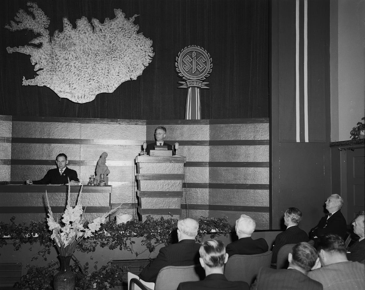 Tjarnarbíó. Reykjavík. Maður í ræðustól í samkomuhúsi, fundarstjóri situr við hlið hans. Íslandskort á tjaldi, merki SÍS og 50 ár þar undir, fólk í sal. Guðmundur Jónsson á Hvítárbakka í ræðustól og Eysteinn Jónsson fundarstjóri. Aðalfundur SÍS, Sambands íslenskra samvinnufélaga 1952, á 50 ára afmæli SÍS. Sjá Samvinnan 1.8.1952.
