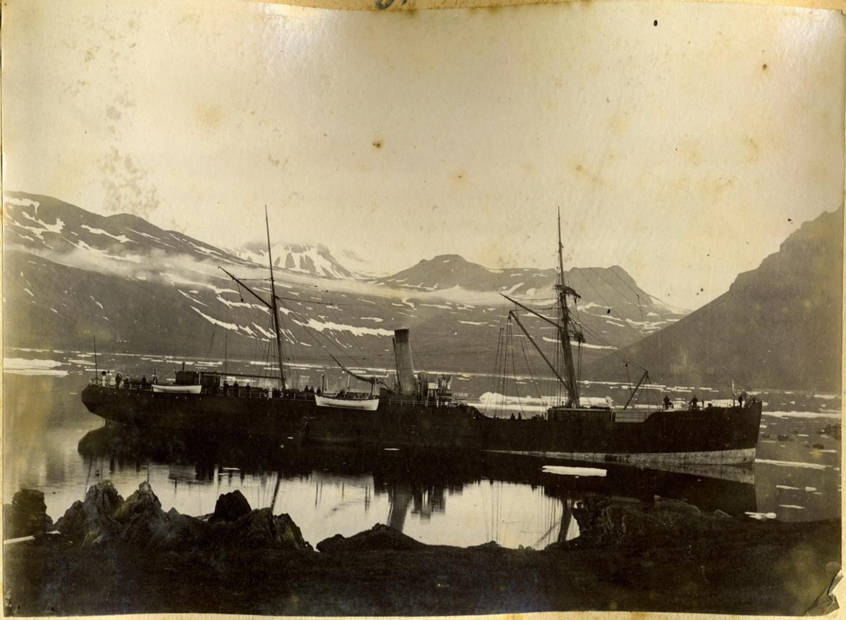 „Það er til önnur víðþekkt mynd af vesturfaraskipinu Camoens við land í Norðurfirði (nálægt Krossnesi) í Árneshreppi á Ströndum sem var nærri örugglega tekin í júní 1883 þegar skipið þurfti að sigla þar að landi til viðgerða eftir að hafa laskast. Skipið lokaðist svo þarna inni í nokkrar vikur vegna hafíss. Á meðan biðu vesturfarar á Borðeyri fram í ágústbyrjun, sumir í tjöldum. Ég tel að þessi mynd sé tekin í sama skipti frá öðru sjónarhorni. Í baksýn er fjallið Urðartindur til hægri og fjöllin ofan við Mela í Árneshreppi.“ (JJ 2017)