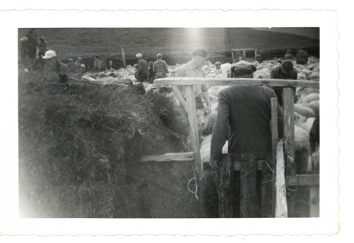 Guðbrandur Benediktsson gætir grindar við Broddanesdilkinn í Fellsrétt á Miðhúsamelum. Þorsteinn sonur hans er til vinstri á myndinni, aðrir eru ekki þekkjanlegir.